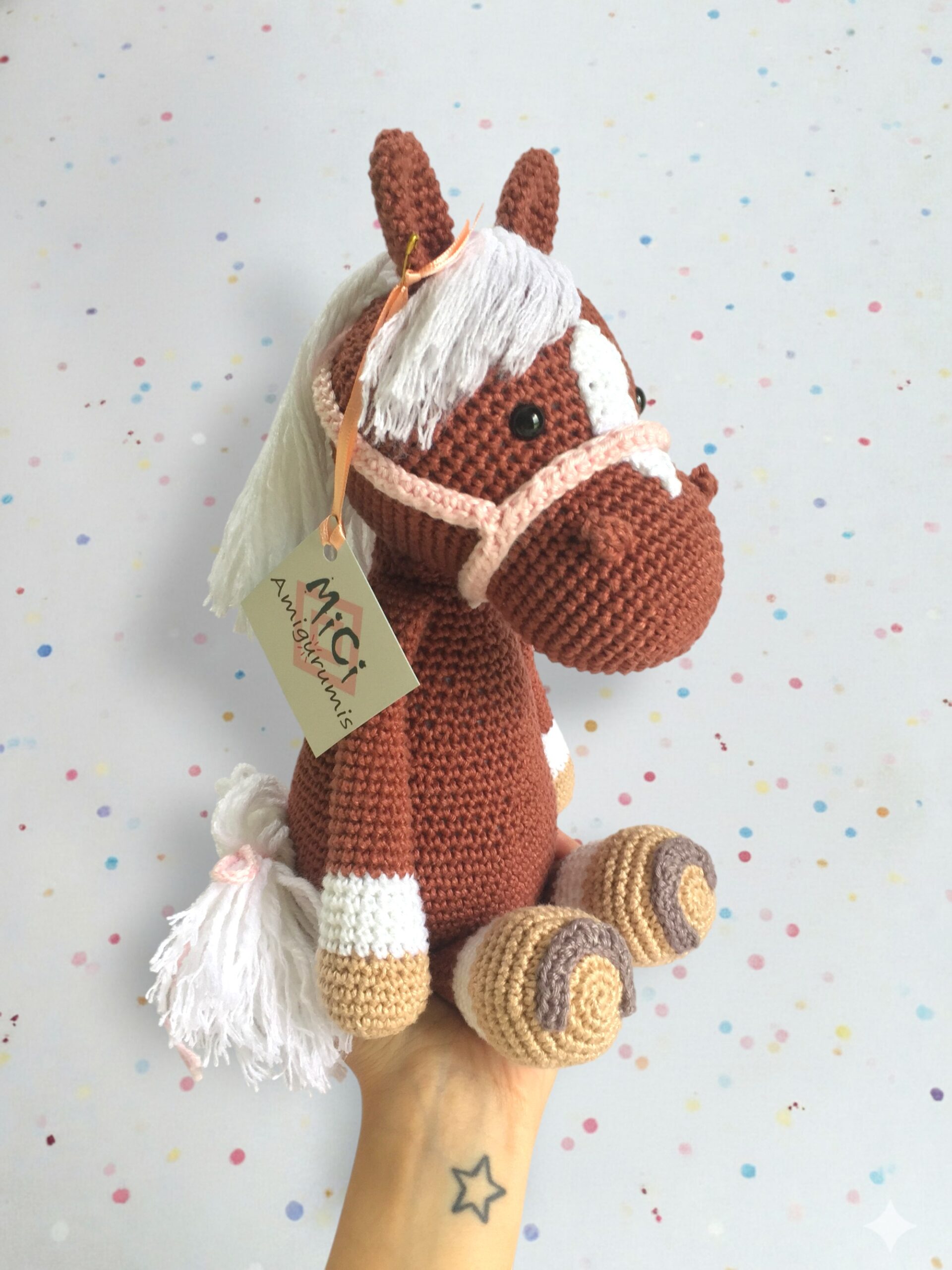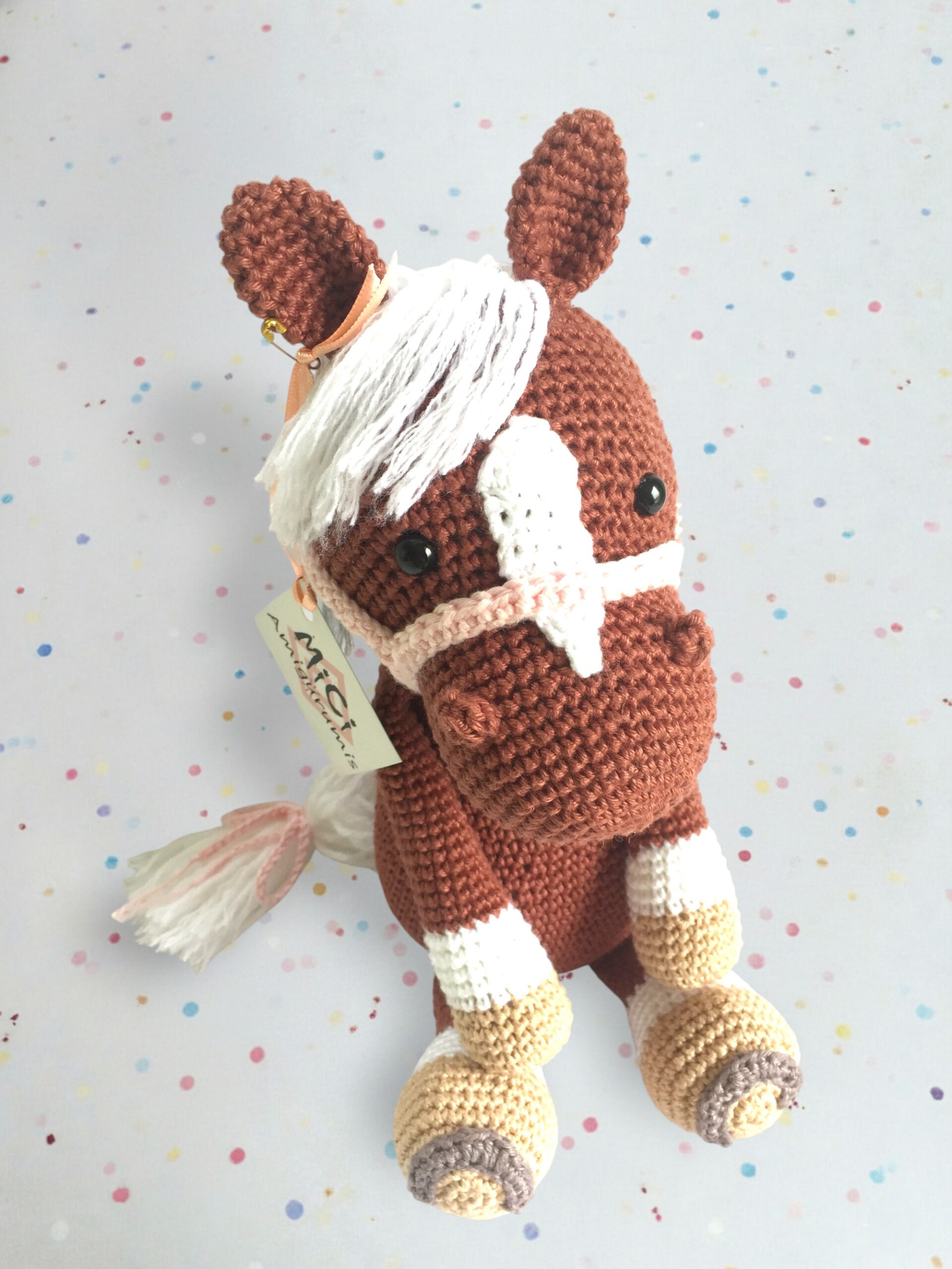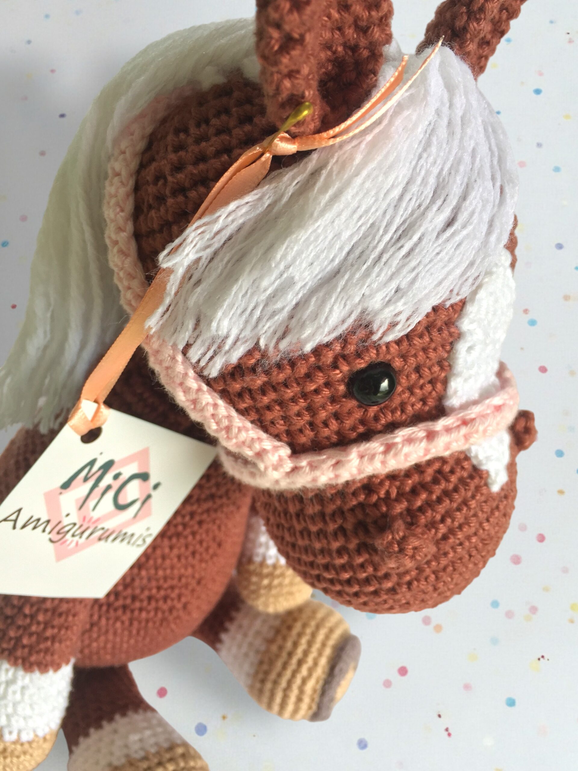 Cavalo Piem em crochê, com olhos que possuem travas de segurança.