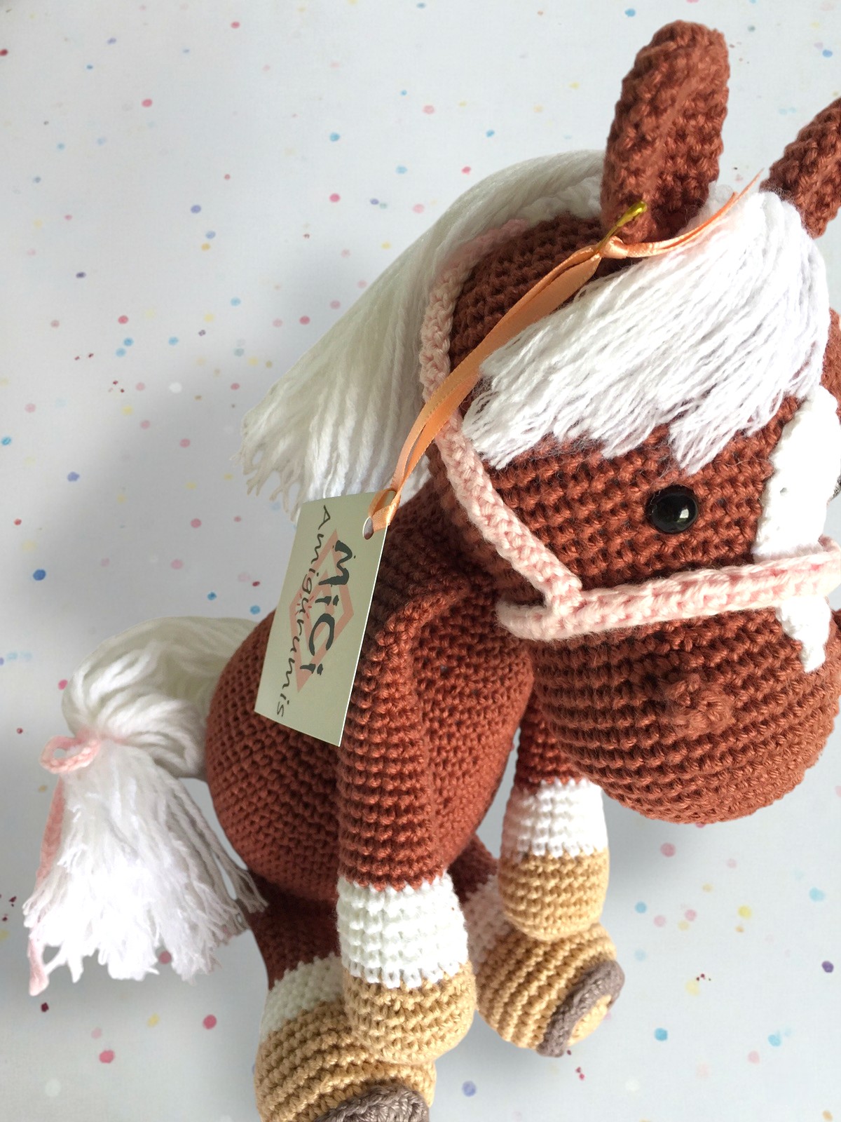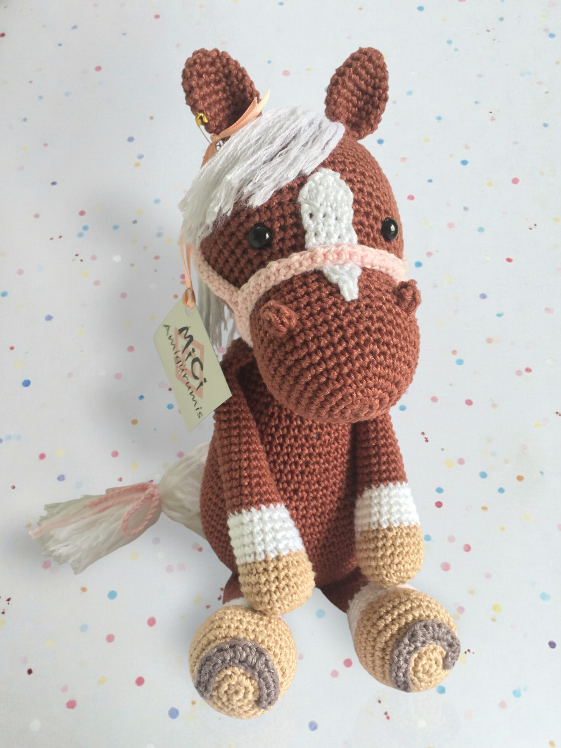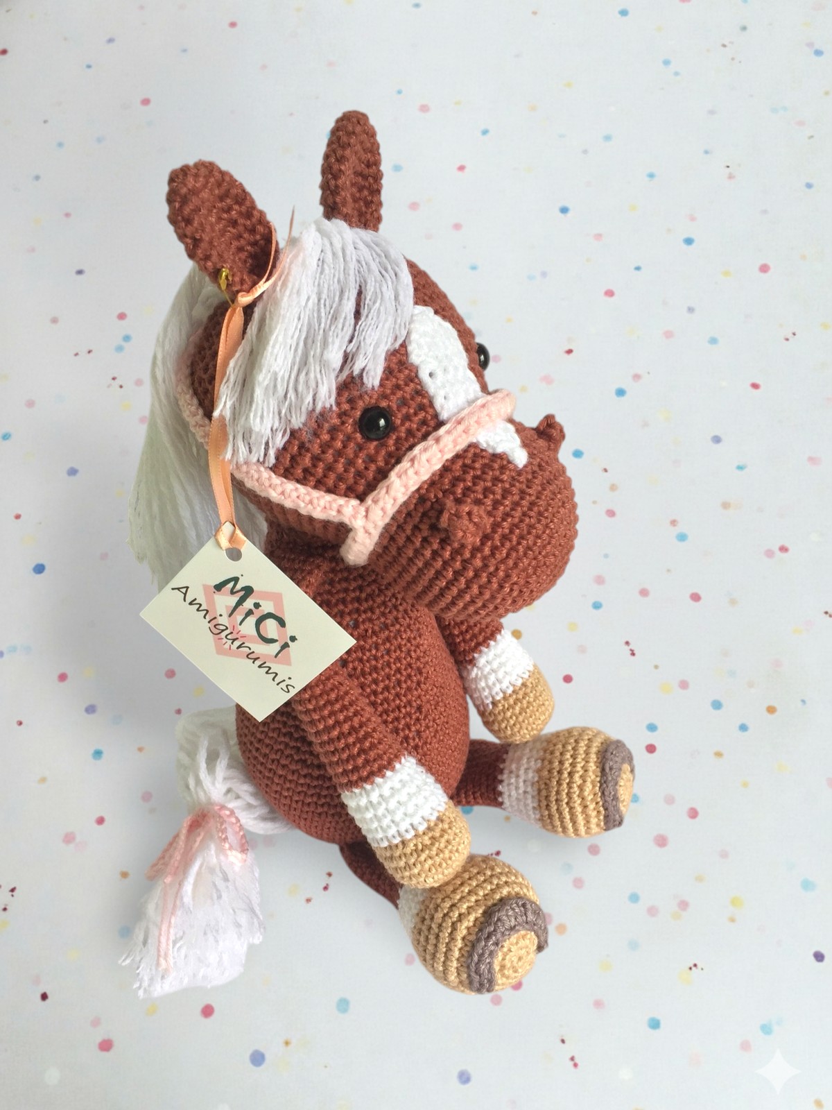 Cavalo Piem em crochê, com olhos que possuem travas de segurança.