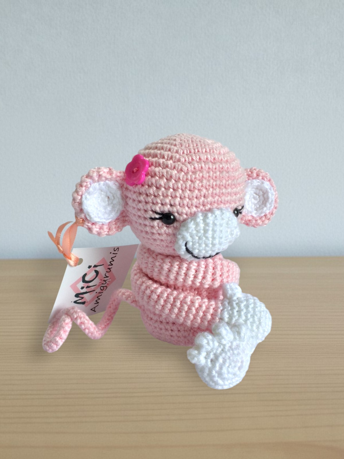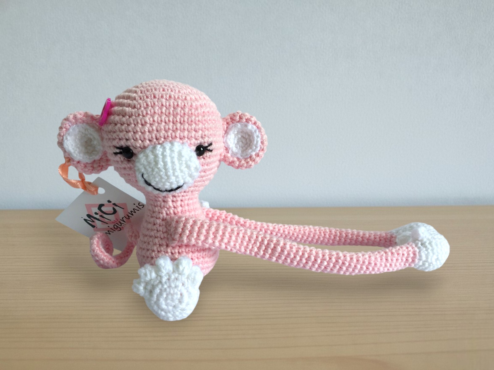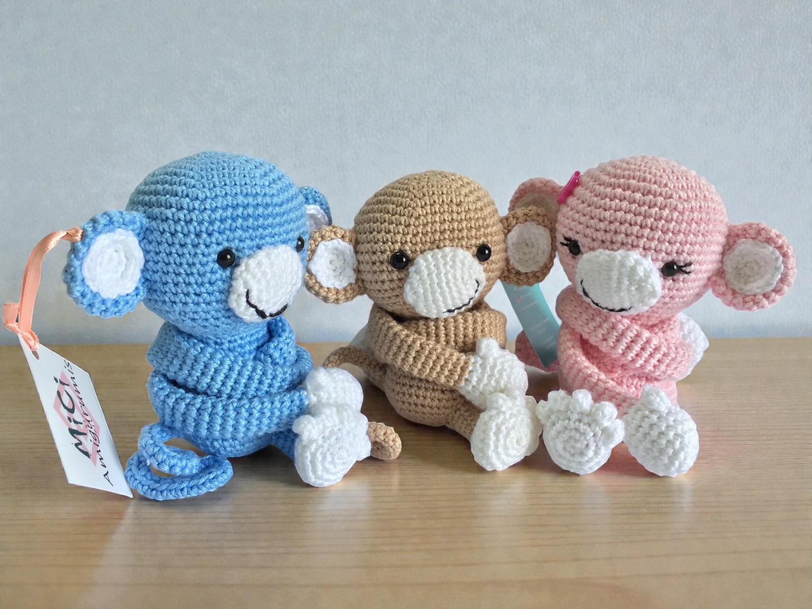 Macaquinho abraça cortina, com olhos que possuem travas de segurança.