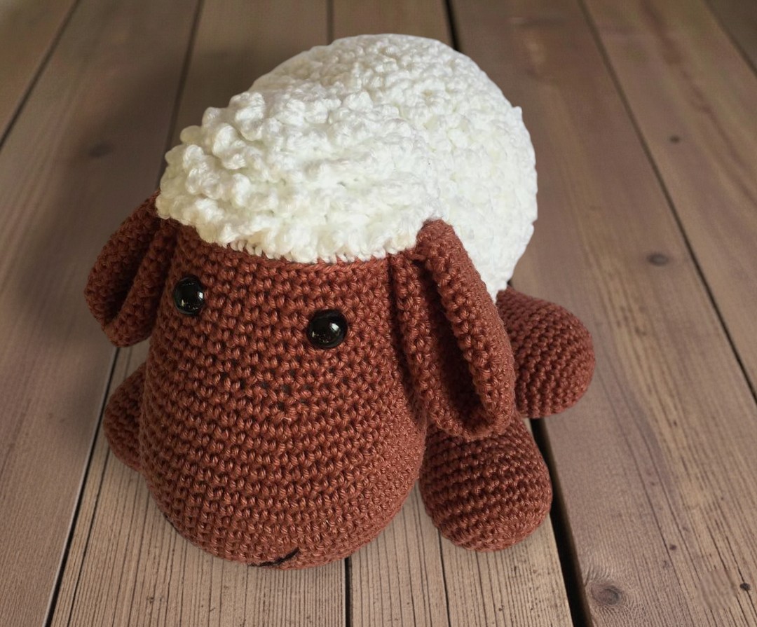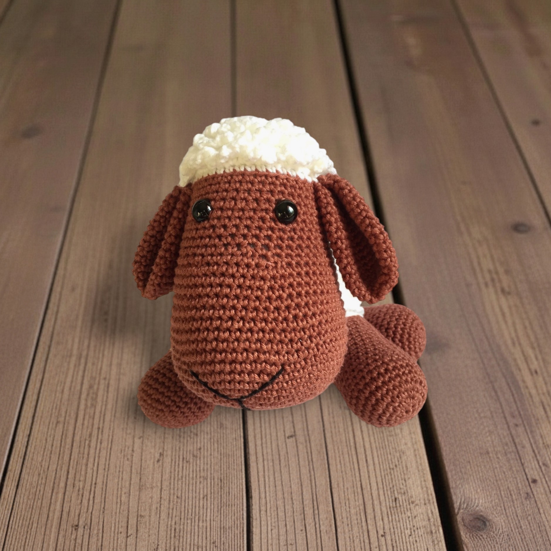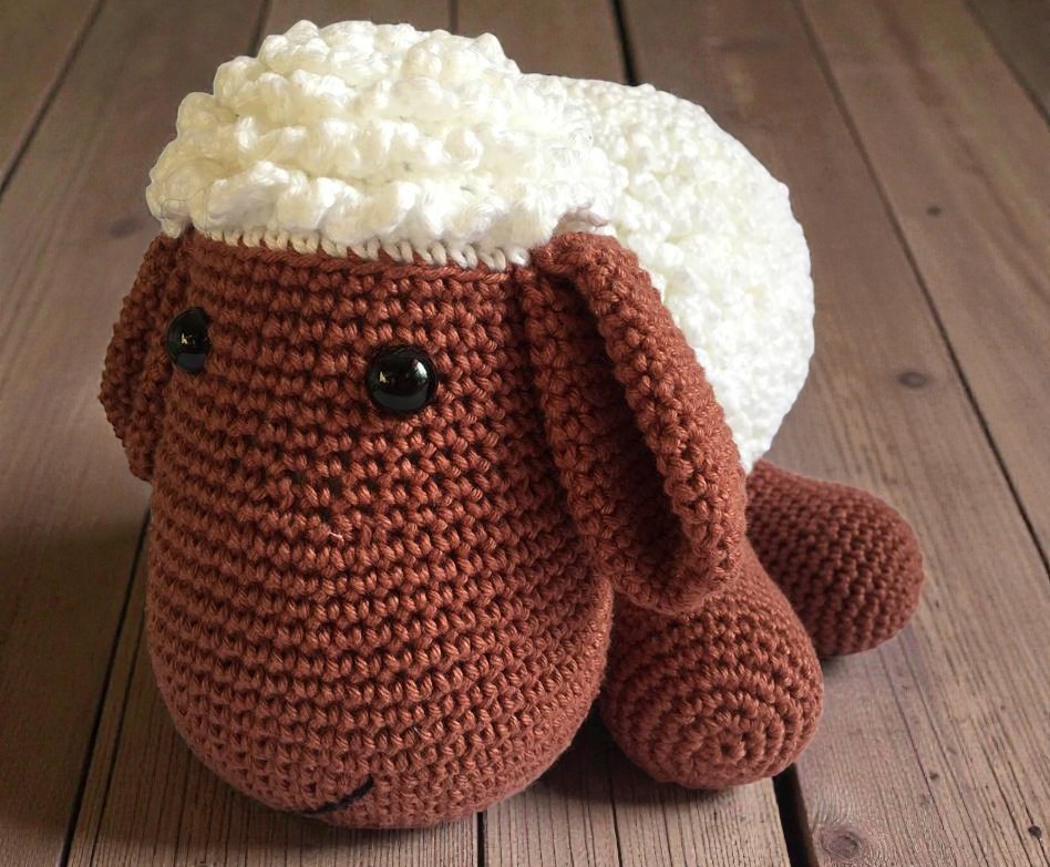 Ovelha Bé em crochê, com olhos que possuem travas de segurança.